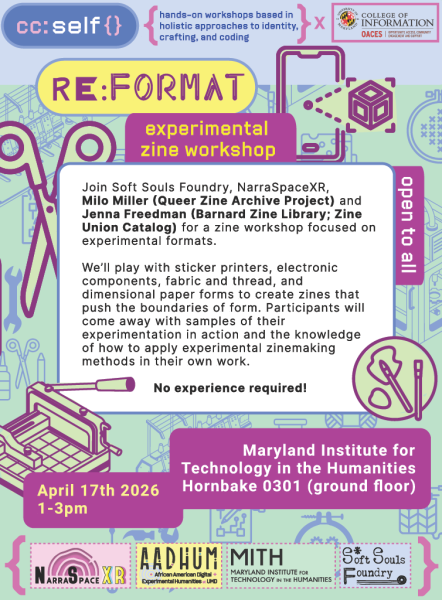 Join Soft Souls Foundry, NarraSpaceXR, Milo Miller (Queer Zine Archive Project), and Jenna Freedman (Barnard Zine Library; Zine Union Catalog) for a zine workshop focused on experimental formats.